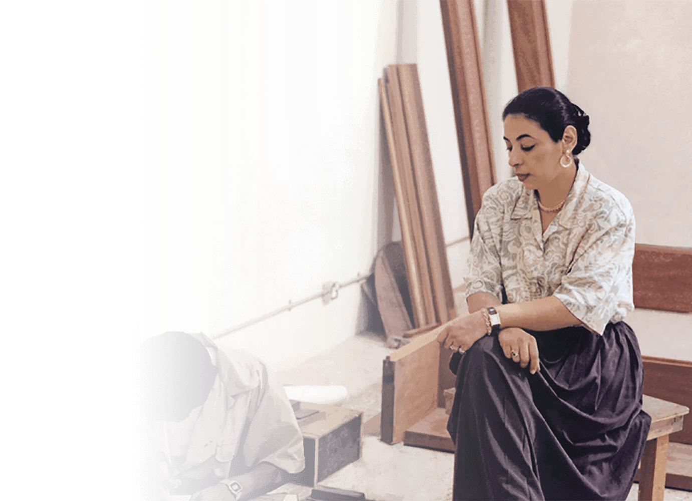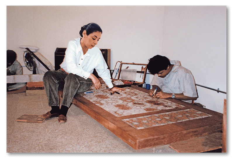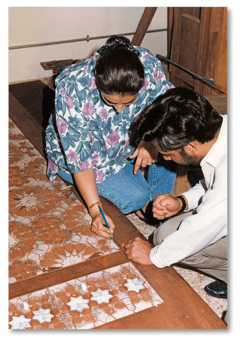 Budgetary realities relative to the ambitions of the project, and the desire to achieve a tight ‘functional-aesthetic’ balance in the final product, meant that by 1988, Aida Al Rowas was tasked with directly managing every aspect of designing, planning, construction, and implementation of the project. This included travel to Jordan, Syria, Egypt and India among others, to procure construction materials and recruit skilled labour. A specialist company was set-up to undertake the civil construction of the building and a purpose-built carpentry workshop in Muscat was established to complete the wooden fixtures, bespoke ornamentation and furnishings throughout the residence. The project was completed in 1993, including all the built-in wooden components. The complete interior design of the house, including additional furniture, lighting and final decorative touches were finished incrementally, during the many years that followed.