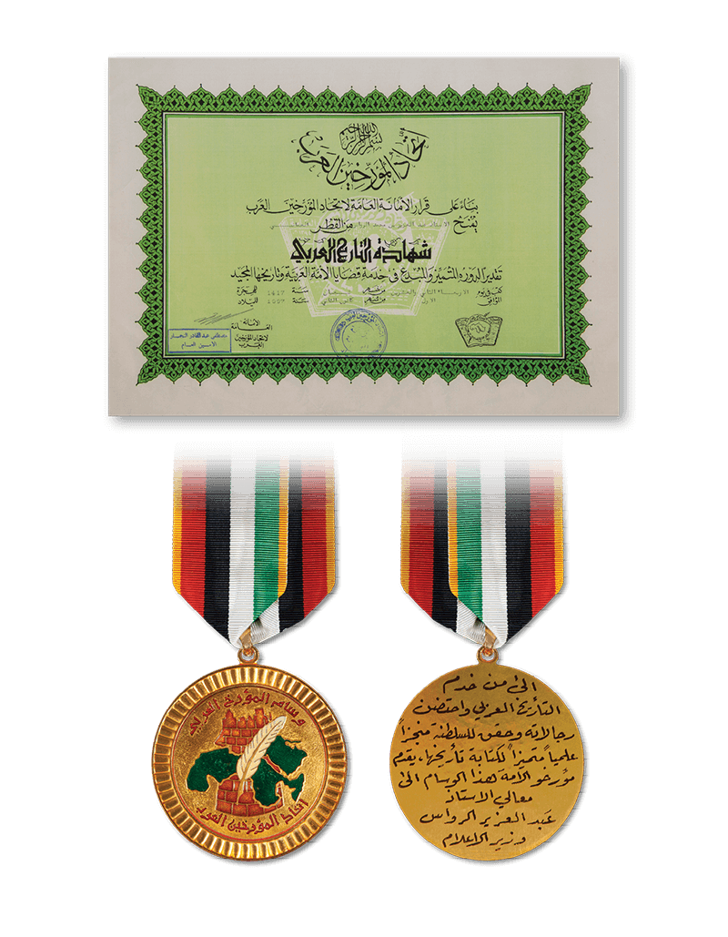 He was honored the medal of “The Arab Historian” by the United General Assembly of Arab Historians. On the back of the medal is the inscription: “To whom served Arab history and embraced its men and achieved on behalf of Oman a significant work to write its history: The United Assembly of Arab Historians present this medal to His Excellence AbdulAziz Al Rowas the Minister of Information.”. 1997.