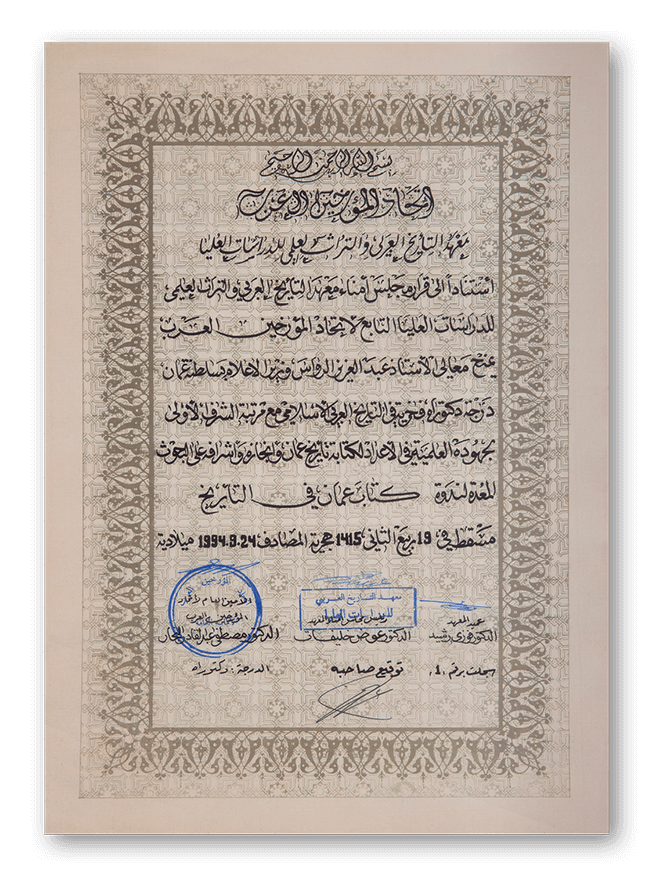 He was also honored by the Academy of Arab Science and history for higher studies which is under the auspices of the General Assembly of Arab Historians the degree of an honorary doctorate in Arab and Islamic History with the highest Honors for his scientific work towards writing Oman’s history and his supervision over many scholarly works in support of the work “Oman in History”. In 1994