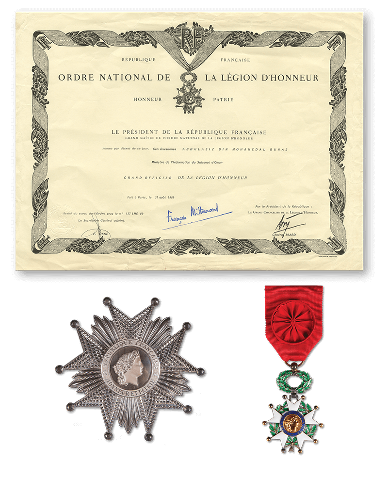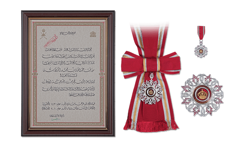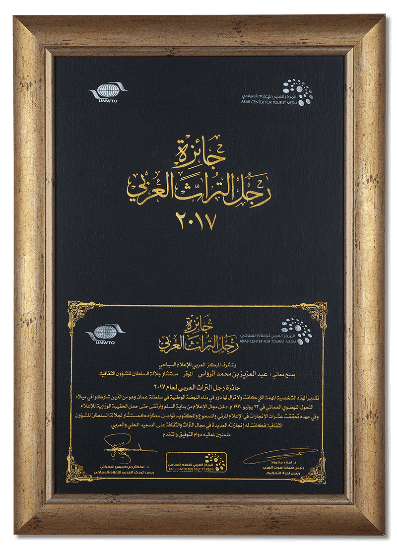In recognition of an illustrious career and his dedication to it, he was granted one of the highest honors in the country, ‘Wissam Al Rusookh’, by the late Sultan Qaboos in 2010 to commemorate his lifetime of service. He was granted the award of ‘The Man of Arab Heritage’ in 2017, after receiving one million votes from around the Arab world.